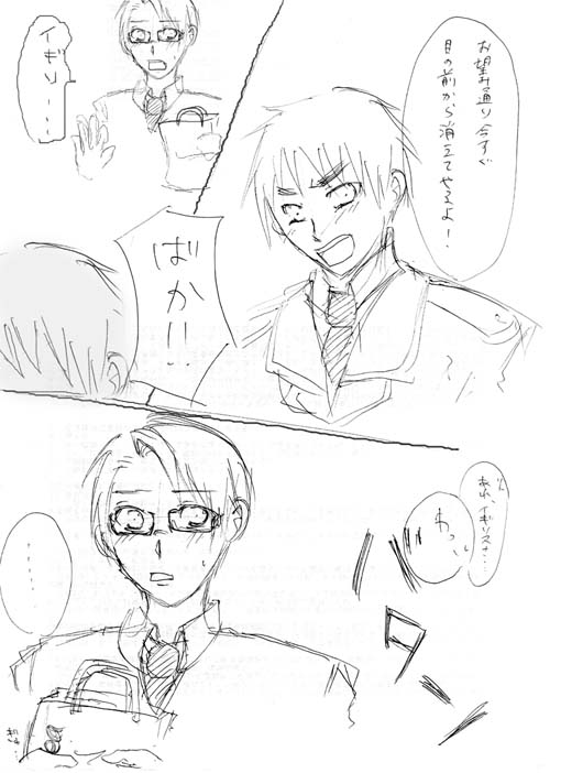 やっぱり落書きは落書きでした。二コマ目のアメリカあたりにやる気のなさが現れている。言い訳すればアメリカほぼ初描きなんだぞ!しかしやっぱり一発描きはだめですね。メリカが持ってる紙袋は紅茶の缶と紅茶クッキーが入っております。この前のシーンでイギリスがメリカの顔面に投げつけたやつねwww
